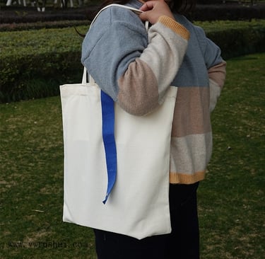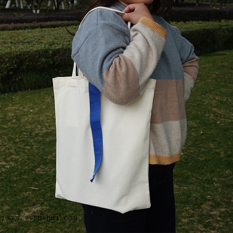 Folding Cotton Tote Bags Near Me Canvas Tote Handbag Cute Blue Ribbon Canvas Shoulder Bag with Button Closure RSQ-1423 Bag specification: 1. Material: 12oz=340gsm beige polyester & canvas blend material 2. Size: 34(width)x40(height)cm = 13.38x15.74inch 3. Handle: Body material 2.5x48cm = 1.0x18.9inch 4. Accessory: Blue webbing handle 3.2x30cm=1.26x11.81inch with button closure 5. Model number: RSQ-1423