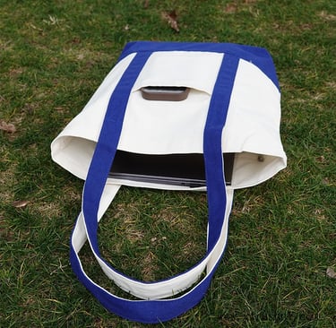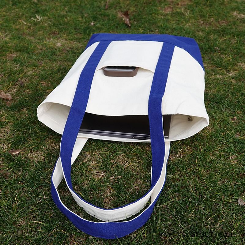 The RSQ-1424 multi-purpose exterior pocket canvas tote bag presents a striking combination of beige and blue, offering a visually appealing aesthetic that balances neutrality with vibrancy. The use of beige as a base color lends a sense of understated elegance, while the blue accents add a touch of contemporary flair. Such a color scheme not only enhances the bag's aesthetic appeal but also contributes significantly to its versatility, making it suitable for a wide range of occasions—from casual outings to semi-formal events.