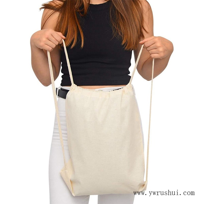 6oz Blank Cotton Drawstring Backpack Plain Cotton Canvas Drawstring Backpack with Custom Logo Bag specification: 1. Material: 6oz=180gsm natural cotton + double strings 2. Size: small 14(width)x16(height)inch=35.5x40.5cm, medium 14(width)x18(height)inch=35.5x45.5cm, large 17(width)x20(height)inch=43x51cm 3. Model number: RSQ-1028